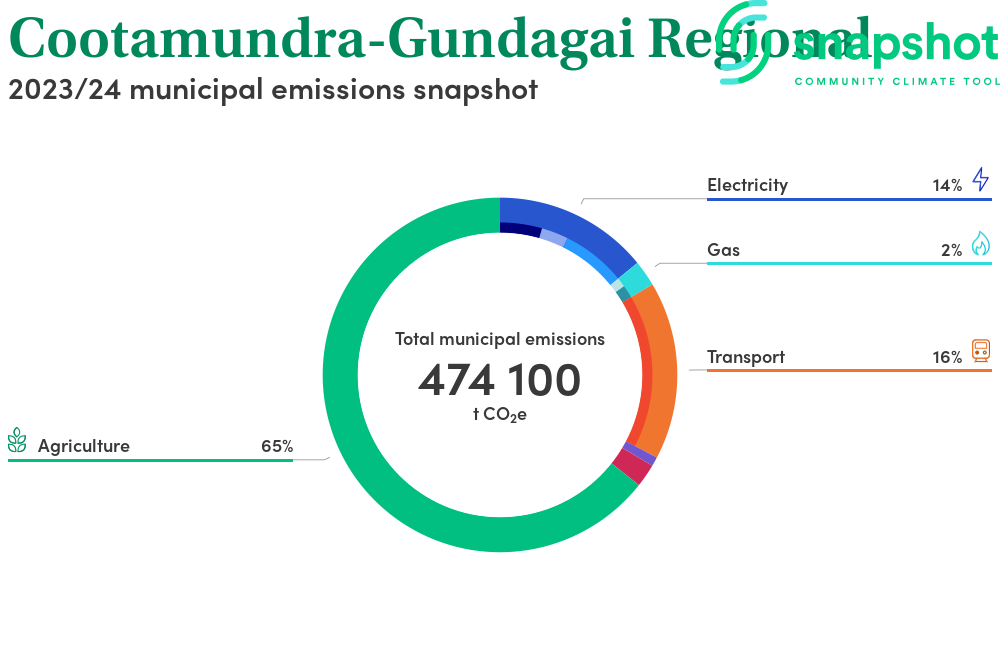 Cootamundra-Gundagai Regional is a regional area that is moderate in size relative to the state average and has a low urban density. Its major emissions source is agriculture, due to the community’s relatively large amount of agricultural activity and low population. The second largest source of emissions is electricity consumption.