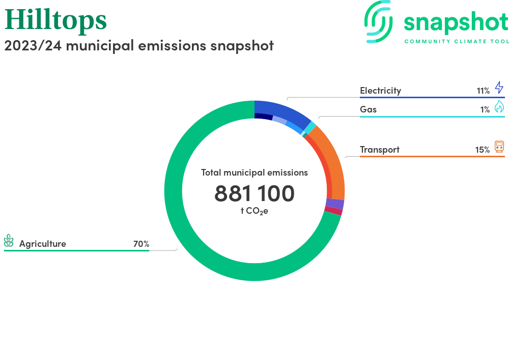 Hilltops is a regional area that is large in geographical area relative to the state average and has a low urban density. Its major emissions source is agriculture, due to the community’s relatively large amount of agricultural activity and low population. The second largest source of emissions is on road transportation.