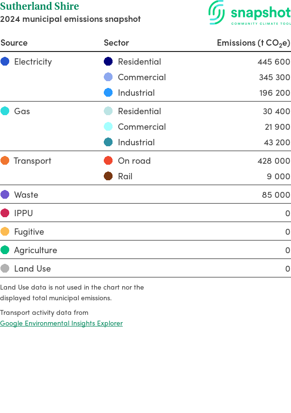 This report outlines the major sources of carbon emissions for the entire region (municipality, electorate, or state). Due to the approximate nature of the profile, the emission values are represented as rounded numbers. This report includes the following sources:
