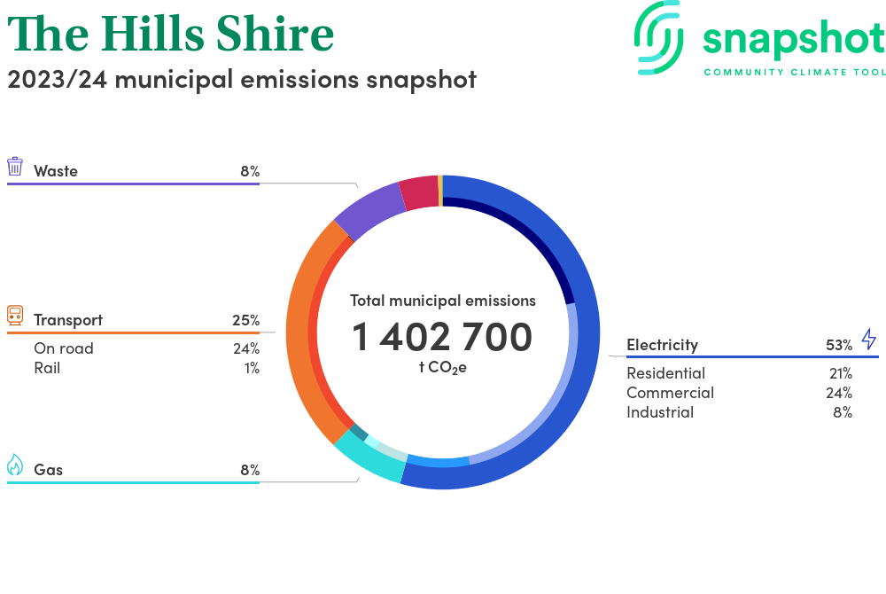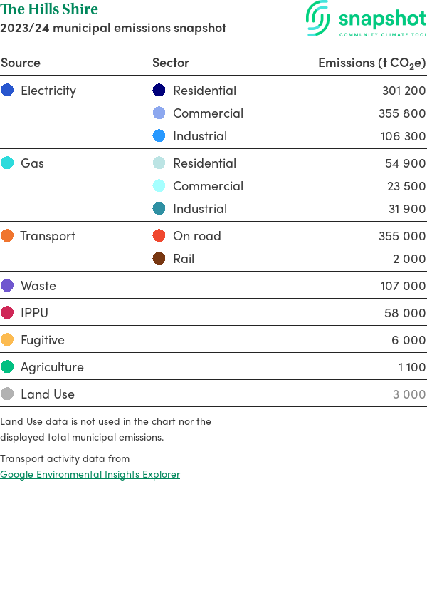 The Hills Shire is a regional area that is geographically small relative to the state average and has a high urban density. Its major emissions source is electricity consumption with the majority of this coming from commercial electricity consumption.