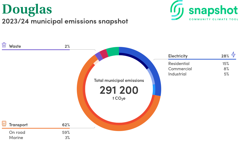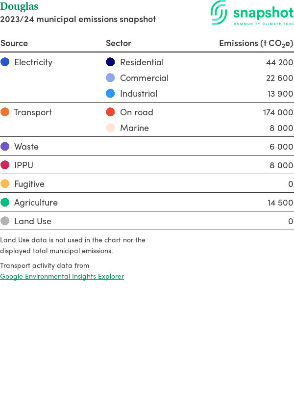 Douglas is a rural municipality that is geographically small relative to the state average and has a moderate urban density. Its major emissions source is on road transportation, due to the community’s larger commuting and other travel requirements. The second largest source of emissions is electricity consumption.