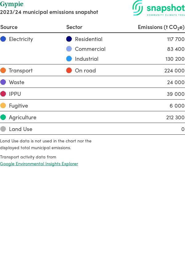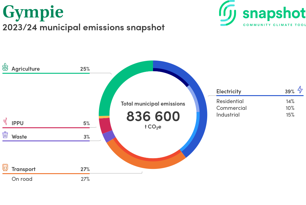 Gympie is a regional area that is large in geographical area relative to the state average and has a moderate urban density. Its major emissions source is electricity consumption, due to the community’s scale of population and commercial activity. The second largest source of emissions is agriculture.