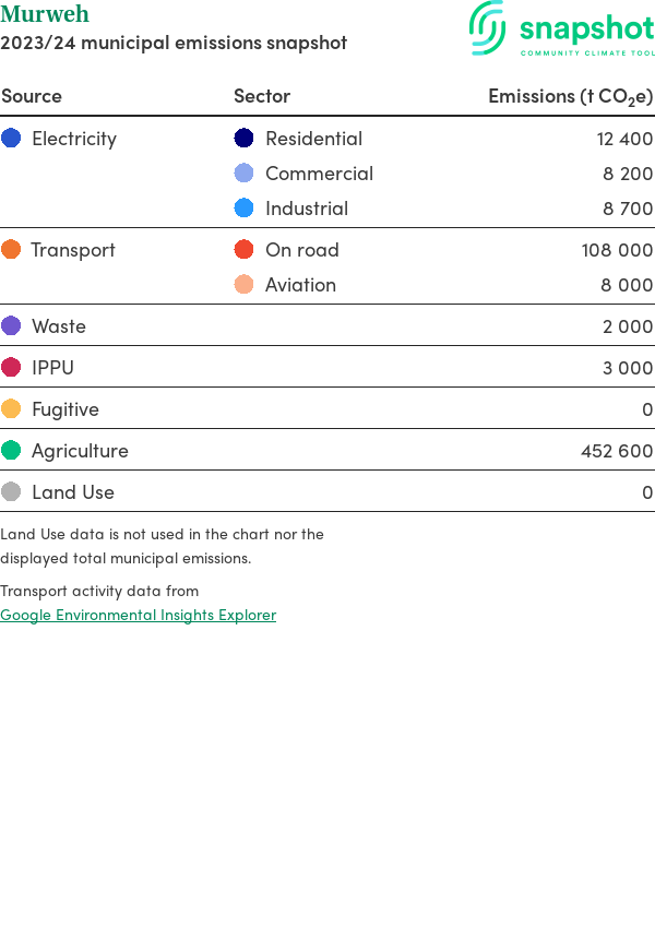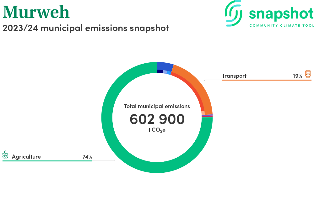 Murweh is a rural municipality that is very large in geographical area relative to the state average and has a low urban density. Its major emissions source is agriculture, due to the community’s relatively large amount of agricultural activity and low population. The second largest source of emissions is on road transportation.