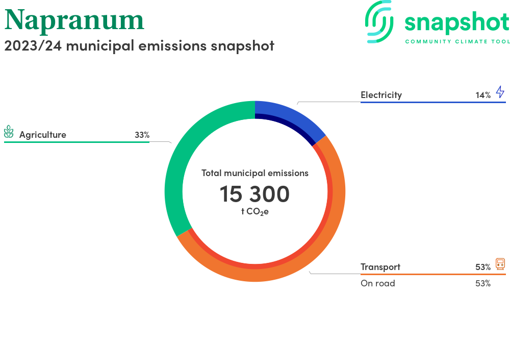 Napranum is a rural municipality that is geographically small relative to the state average and has a low urban density. Its major emissions source is on road transportation, due to the community’s larger commuting and other travel requirements. The second largest source of emissions is agriculture.