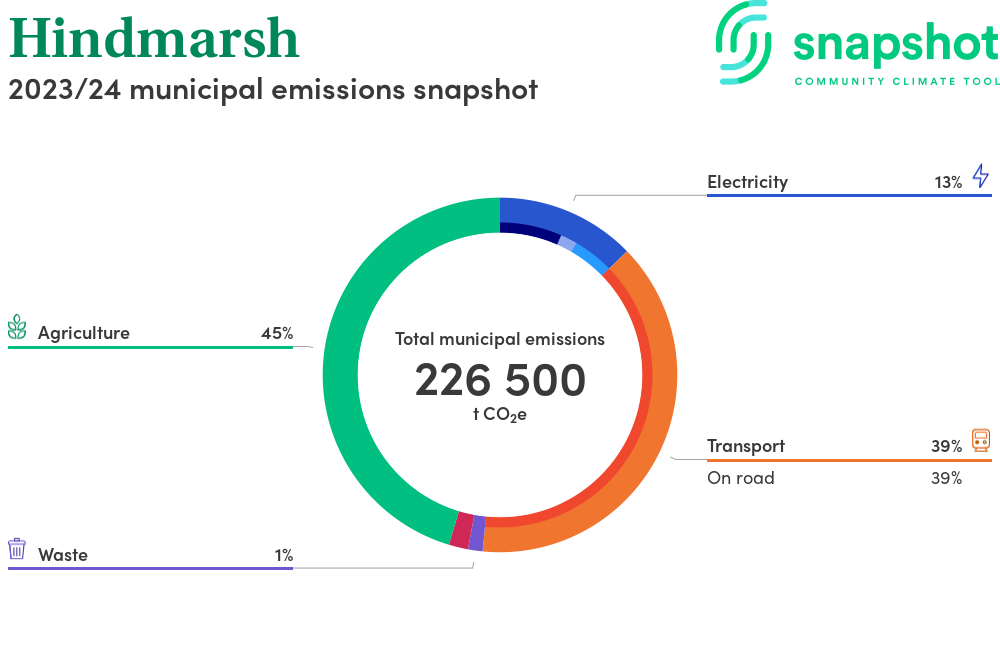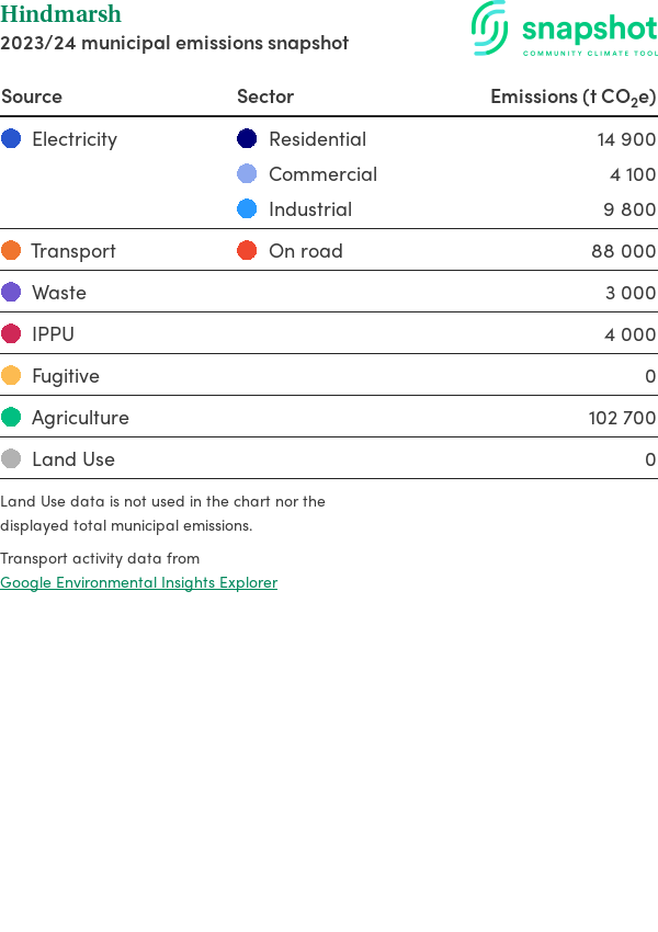 Hindmarsh is a rural municipality that is large in geographical area relative to the state average and has a very low urban density. Its major emissions source is agriculture, due to the community’s relatively large amount of agricultural activity and low population. The second largest source of emissions is on road transportation.