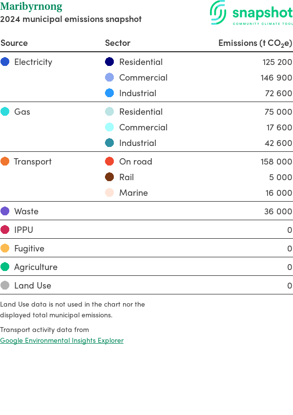 This report outlines the major sources of carbon emissions for the entire region (municipality, electorate, or state). Due to the approximate nature of the profile, the emission values are represented as rounded numbers. This report includes the following sources: