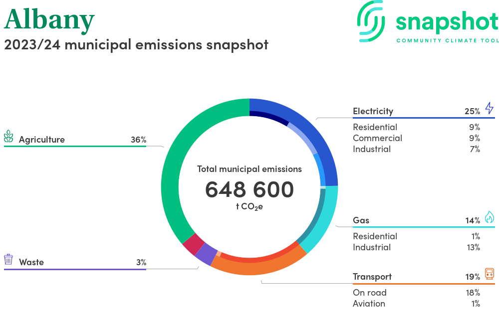 Albany is a city that is moderate in size relative to the state average and has a moderate urban density. Its major emissions source is agriculture, due to the community’s relatively large amount of agricultural activity and low population. The second largest source of emissions is electricity consumption.