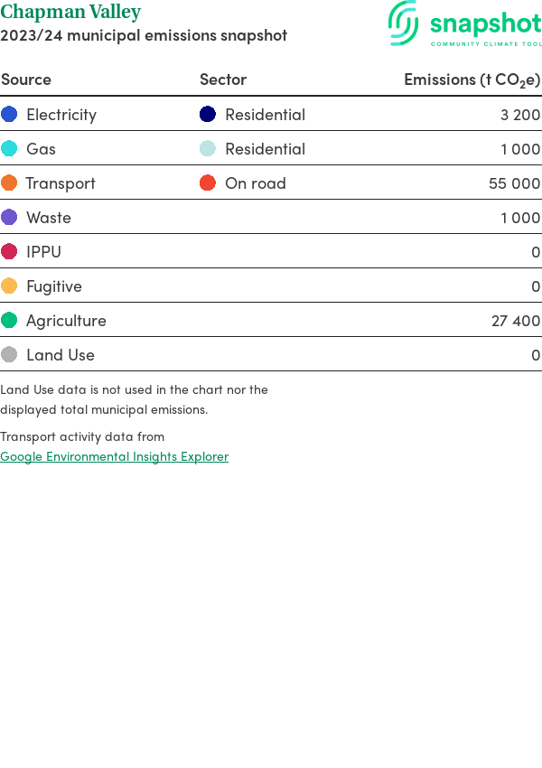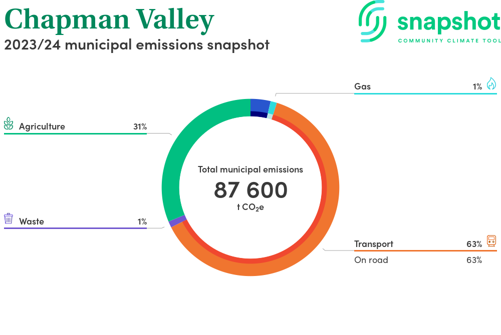 Chapman Valley is a rural municipality that is moderate in size relative to the state average and has a low urban density. Its major emissions source is on road transportation, due to the community’s larger commuting and other travel requirements. The second largest source of emissions is agriculture.