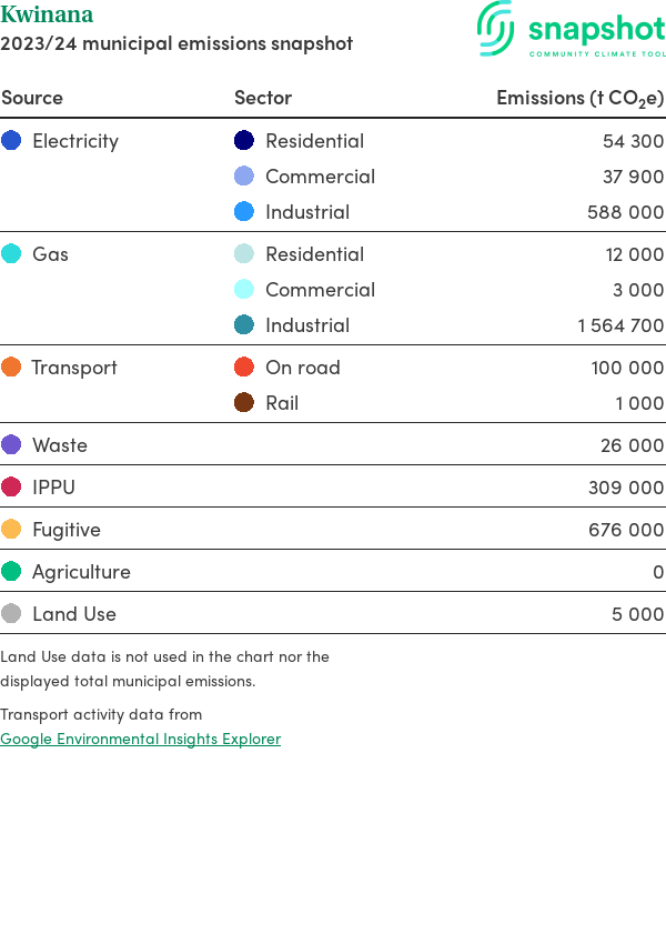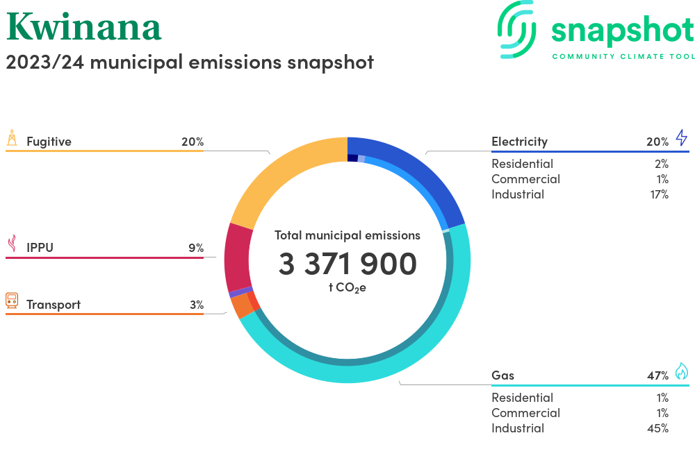Kwinana is a city that is geographically small relative to the state average and has a high urban density. Its major emissions source is gas consumption, due to the community’s relatively large population and commercial activity. The second largest source of emissions is industrial gas consumption.