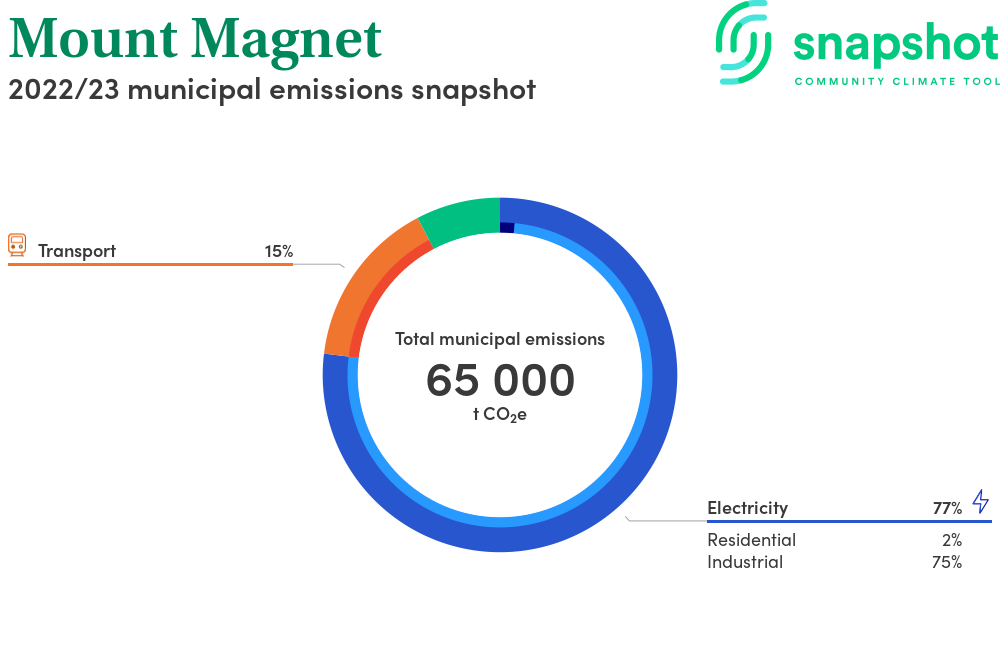 Mount Magnet is a rural municipality that is large in geographical area relative to the state average and has a very low urban density. Its major emissions source is electricity consumption with the majority of this coming from industrial electricity consumption.