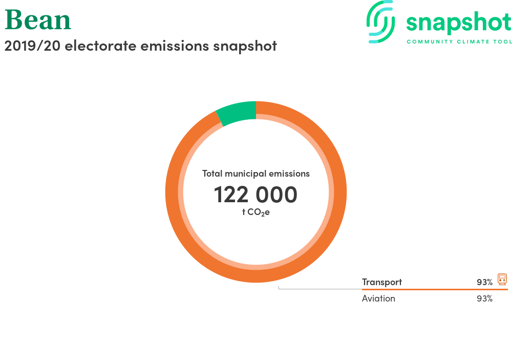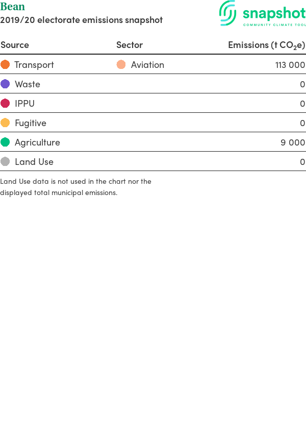 Bean is a federal electorate that is moderate in size relative to the state average and has a high urban density. Its major emissions source is aviation, due to the state’s presence of an airport. The second largest source of emissions is agriculture.