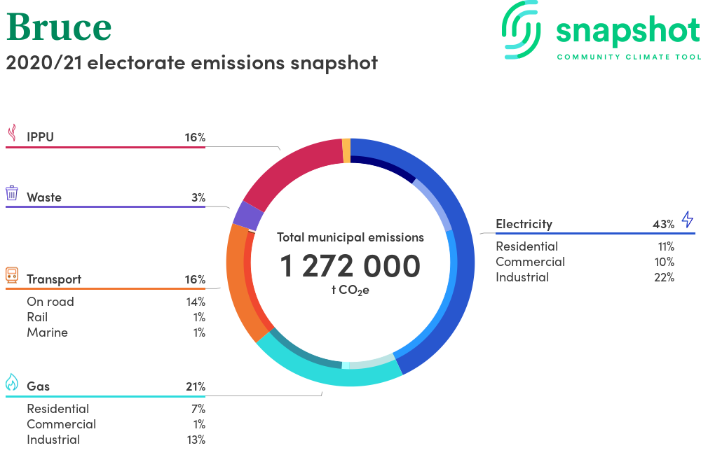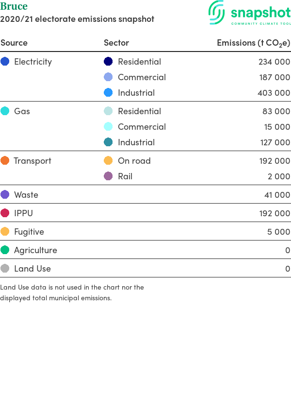 Bruce is a federal electorate that is geographically small relative to the state average and has a moderate urban density. Its major emissions source is electricity consumption with the majority of this coming from industrial electricity consumption.