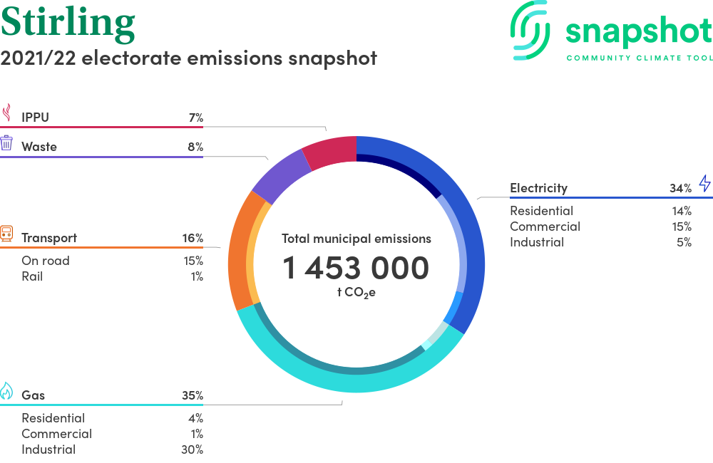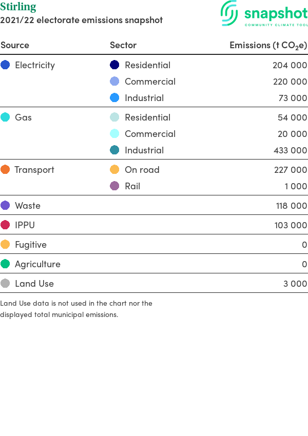 Stirling is a federal electorate that is geographically small relative to the state average and has a very high urban density. Its major emissions source is gas consumption, due to the state’s relatively large population and commercial activity. The second largest source of emissions is industrial gas consumption.