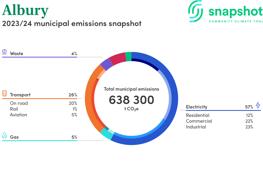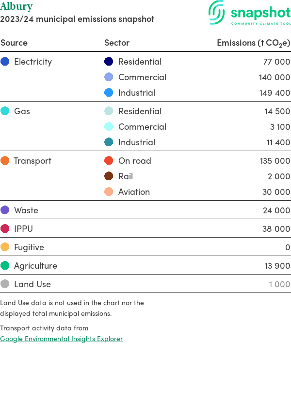 Albury is a city that is geographically small relative to the state average and has a moderate urban density. Its major emissions source is electricity consumption with the majority of this coming from industrial electricity consumption.