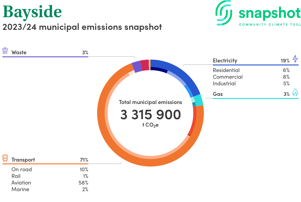 Bayside is a regional area that is geographically very small relative to the state average and has a very high urban density. Its major emissions source is aviation, due to the community’s presence of an airport. The second largest source of emissions is electricity consumption.