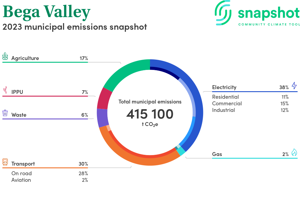 Bega Valley is a regional area that is geographically very small relative to the state average and has a high urban density. Its major emissions source is electricity consumption, due to the community’s scale of population and commercial activity. The second largest source of emissions is on road transportation.