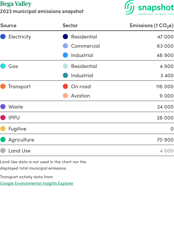 This report outlines the major sources of carbon emissions for the entire region (municipality, electorate, or state). Due to the approximate nature of the profile, the emission values are represented as rounded numbers. This report includes the following sources: