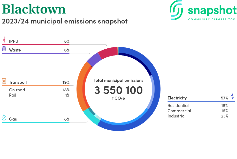 Blacktown is a city that is geographically small relative to the state average and has a moderate urban density. Its major emissions source is electricity consumption with the majority of this coming from industrial electricity consumption.