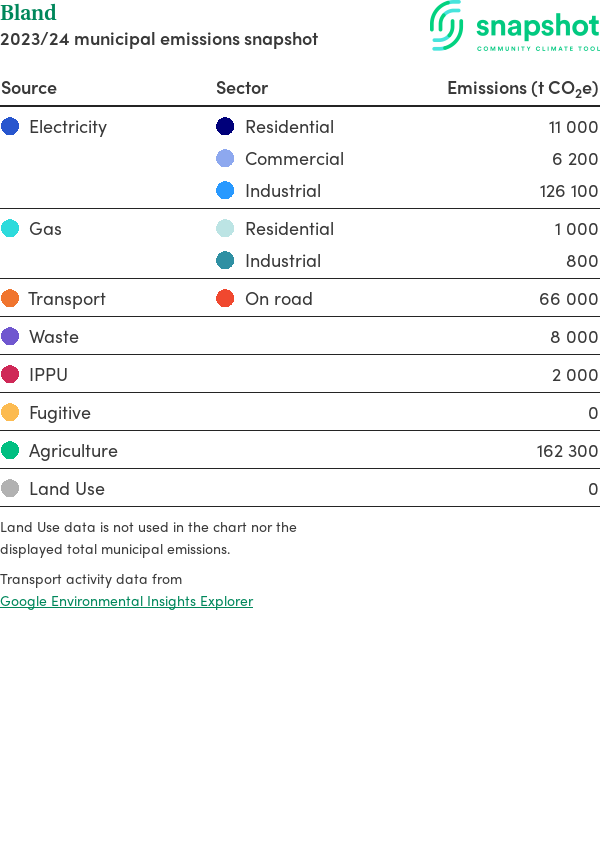 Bland is a regional area that is geographically small relative to the state average and has a moderate urban density. Its major emissions source is agriculture, due to the community’s relatively large amount of agricultural activity and low population. The second largest source of emissions is electricity consumption.