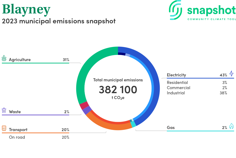 Blayney is a regional area that is large in geographical area relative to the state average and has a very low urban density. Its major emissions source is electricity consumption with the majority of this coming from industrial electricity consumption.