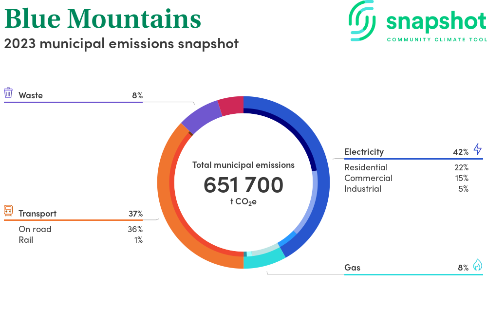 Blue Mountains is a city that is geographically small relative to the state average and has a moderate urban density. Its major emissions source is electricity consumption, due to the community’s scale of population and commercial activity. The second largest source of emissions is on road transportation.