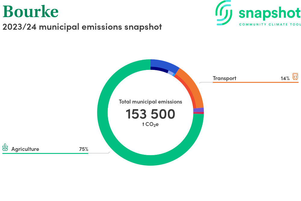 Bourke is a regional area that is very large in geographical area relative to the state average and has a very low urban density. Its major emissions source is agriculture, due to the community’s relatively large amount of agricultural activity and low population. The second largest source of emissions is on road transportation.