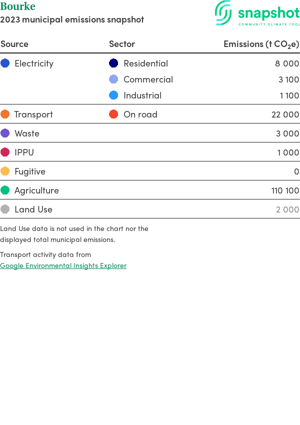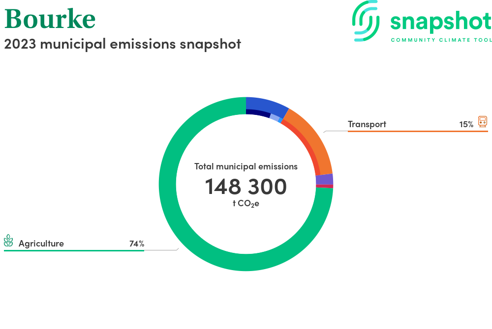Bourke is a regional area that is very large in geographical area relative to the state average and has a very low urban density. Its major emissions source is agriculture, due to the community’s relatively large amount of agricultural activity and low population. The second largest source of emissions is on road transportation.