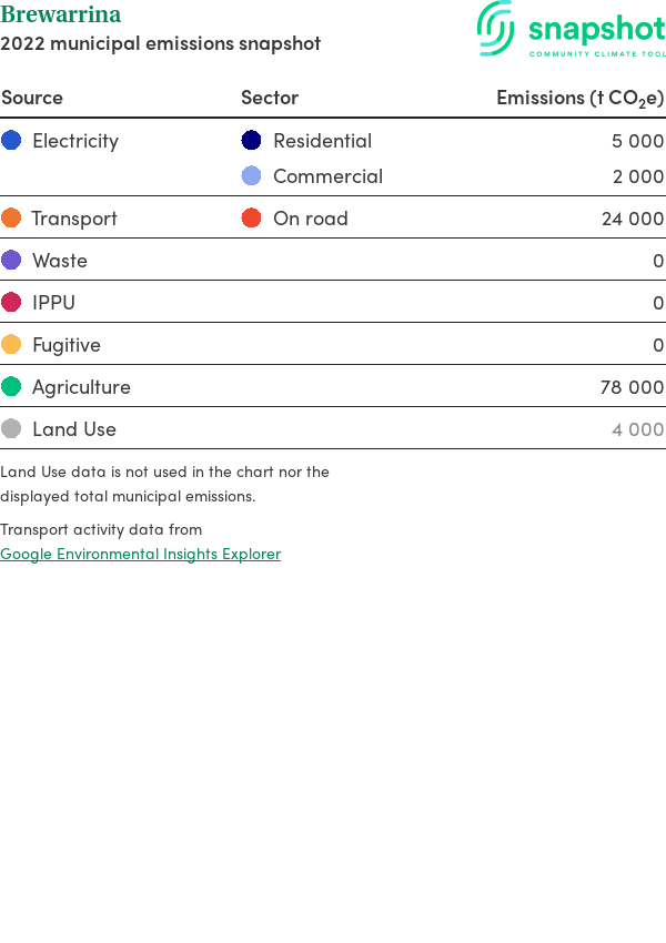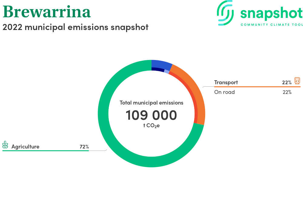 Brewarrina is a regional area that is large in geographical area relative to the state average and has a very low urban density. Its major emissions source is agriculture, due to the community’s relatively large amount of agricultural activity and low population. The second largest source of emissions is on road transportation.
