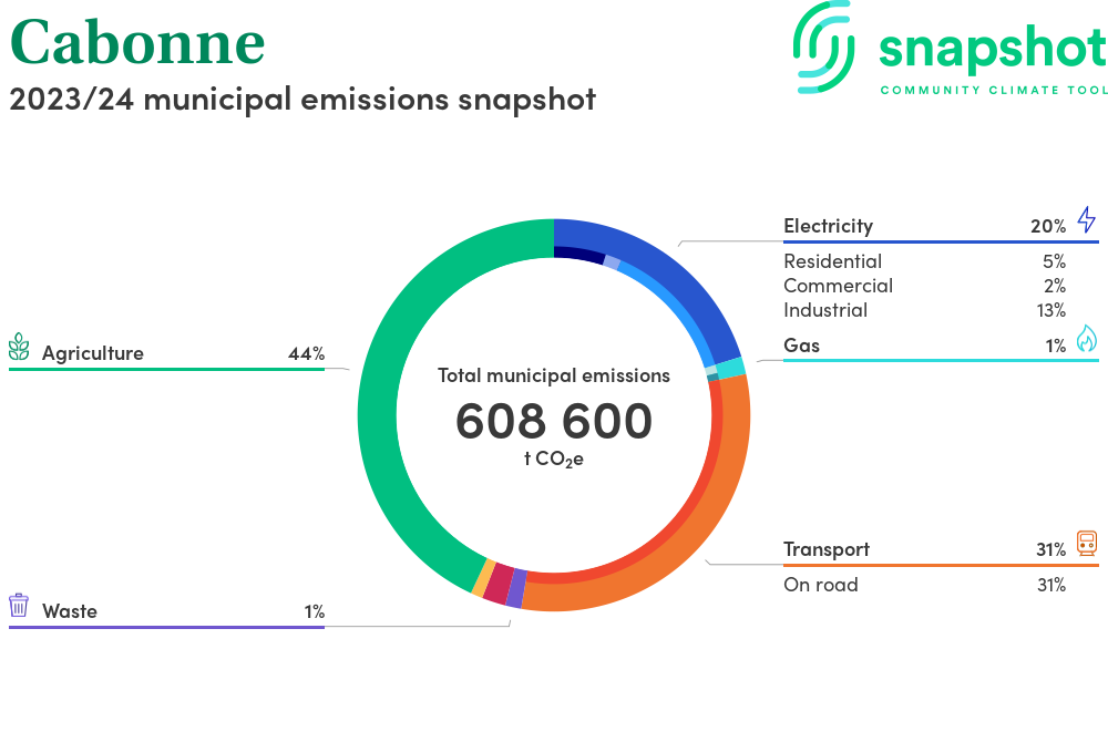 Cabonne is a regional area that is moderate in size relative to the state average and has a low urban density. Its major emissions source is agriculture, due to the community’s relatively large amount of agricultural activity and low population. The second largest source of emissions is on road transportation.