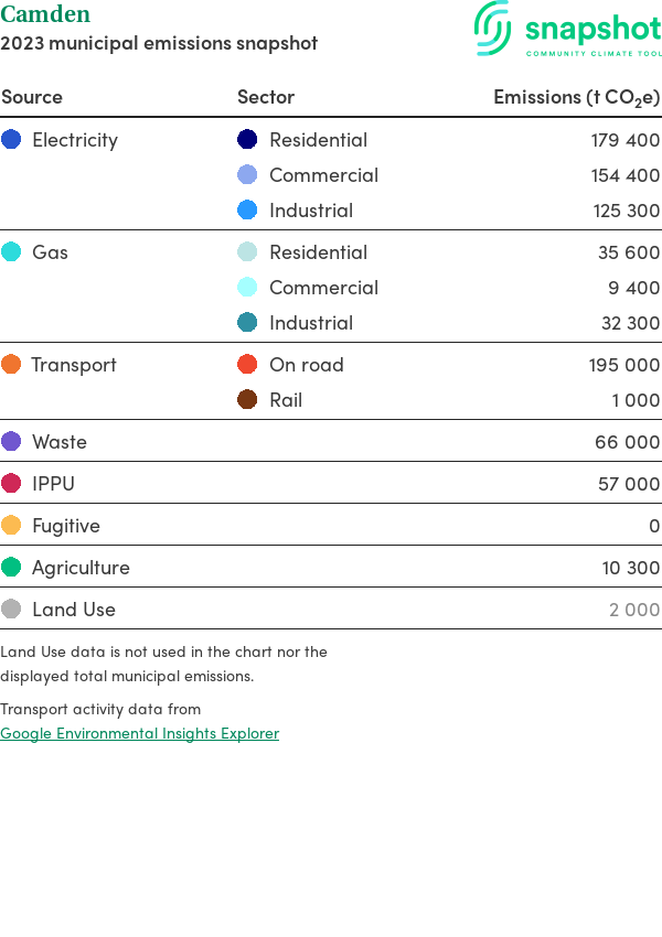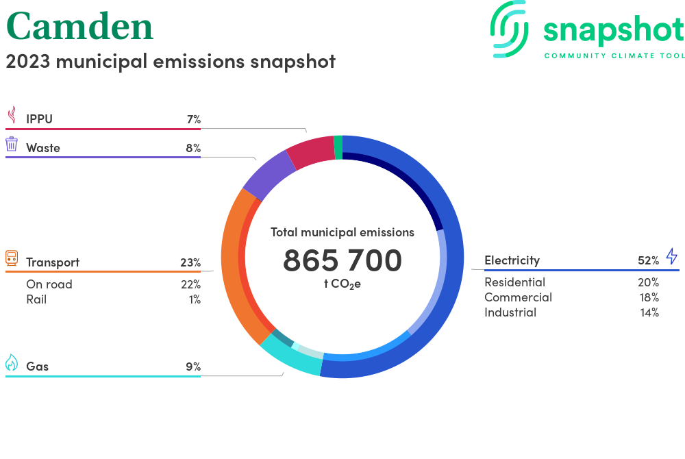 Camden is a regional area that is geographically small relative to the state average and has a high urban density. Its major emissions source is electricity consumption with the majority of this coming from residential electricity consumption.