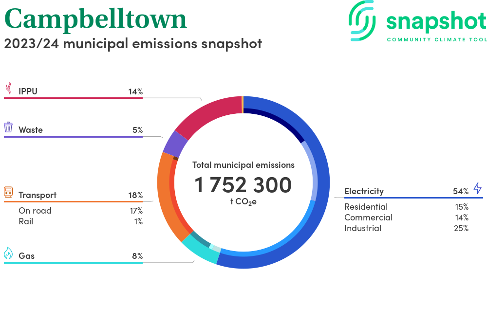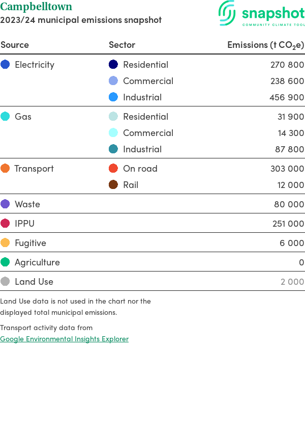 Campbelltown is a city that is geographically small relative to the state average and has a high urban density. Its major emissions source is electricity consumption with the majority of this coming from industrial electricity consumption.