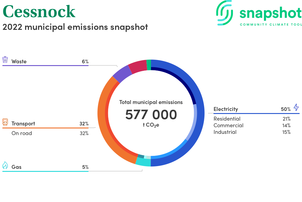 Cessnock is a city that is geographically small relative to the state average and has a moderate urban density. Its major emissions source is electricity consumption, due to the community’s scale of population and commercial activity. The second largest source of emissions is on road transportation.
