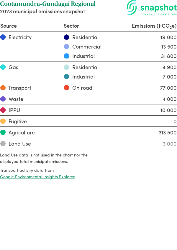 Cootamundra-Gundagai Regional is a regional area that is moderate in size relative to the state average and has a low urban density. Its major emissions source is agriculture, due to the community’s relatively large amount of agricultural activity and low population. The second largest source of emissions is electricity consumption.