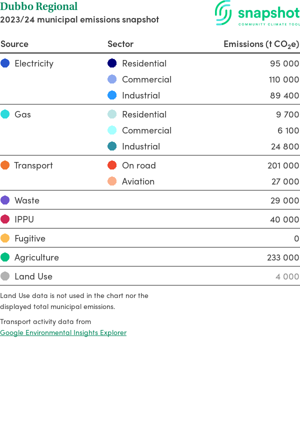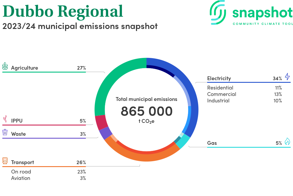 Dubbo Regional is a regional area that is large in geographical area relative to the state average and has a low urban density. Its major emissions source is electricity consumption, due to the community’s scale of population and commercial activity. The second largest source of emissions is agriculture.