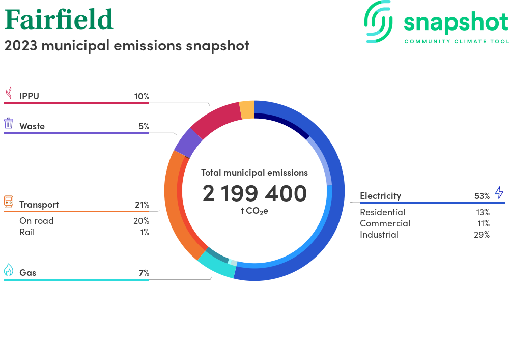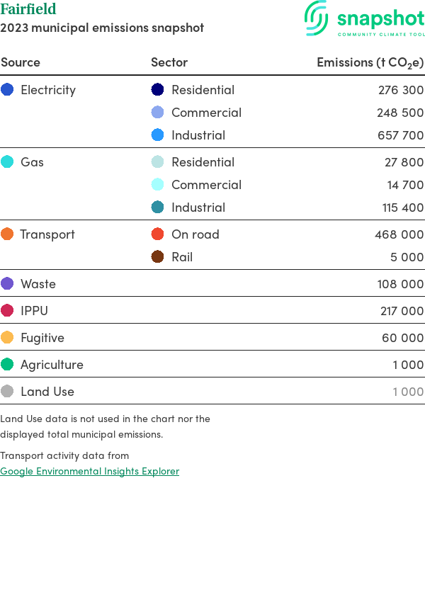 Fairfield is a city that is geographically small relative to the state average and has a high urban density. Its major emissions source is electricity consumption with the majority of this coming from industrial electricity consumption.