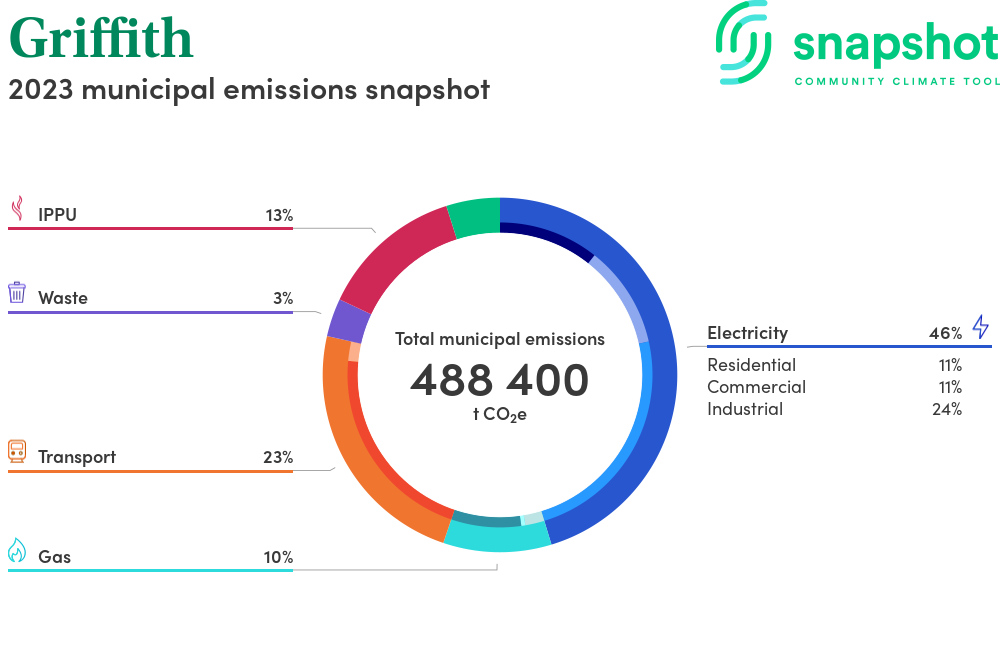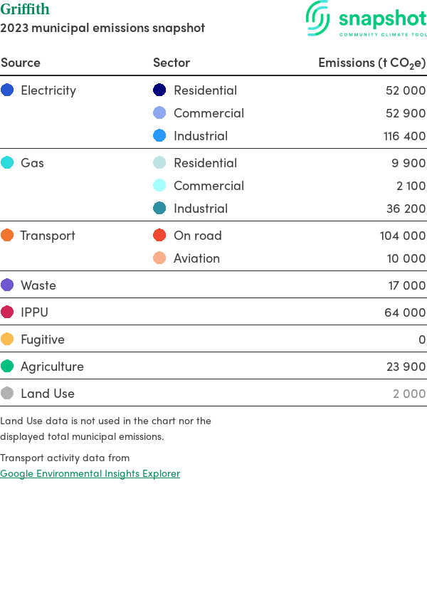 Griffith is a city that is geographically small relative to the state average and has a moderate urban density. Its major emissions source is electricity consumption with the majority of this coming from industrial electricity consumption.
