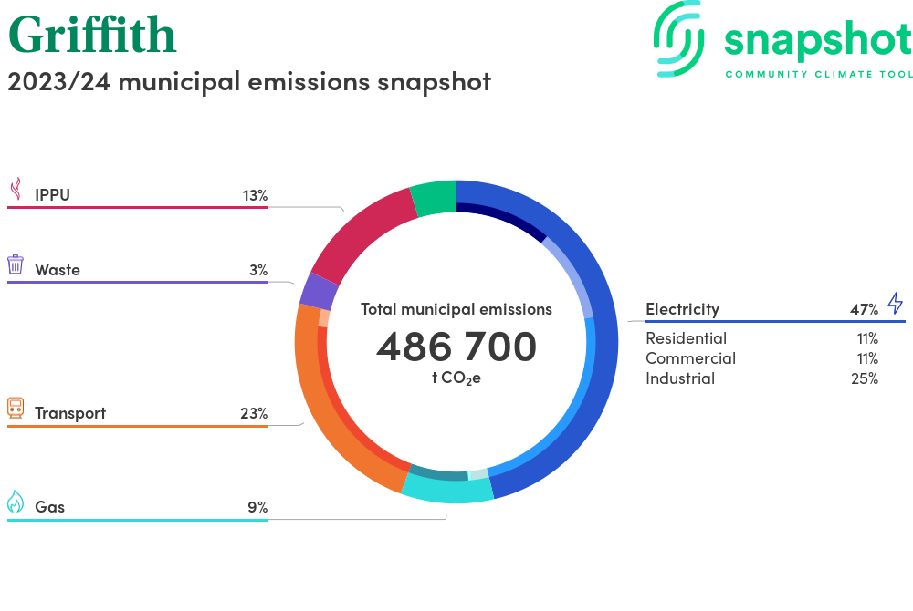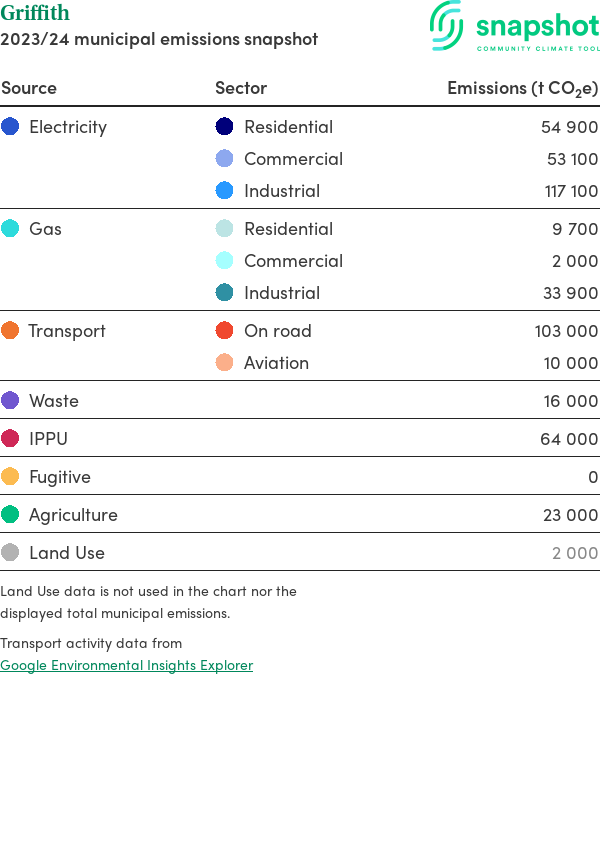 Griffith is a city that is geographically small relative to the state average and has a moderate urban density. Its major emissions source is electricity consumption with the majority of this coming from industrial electricity consumption.