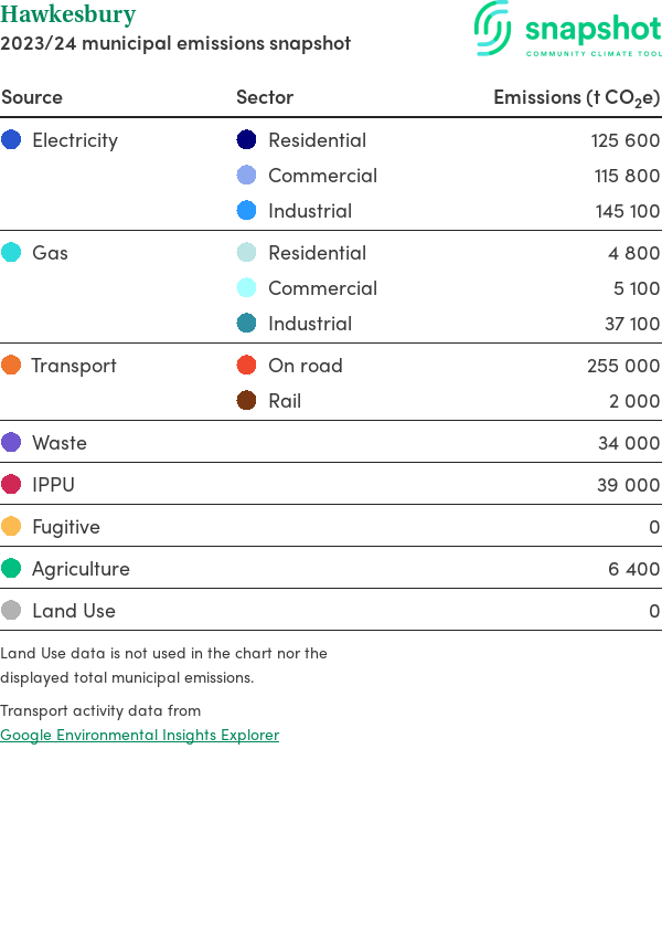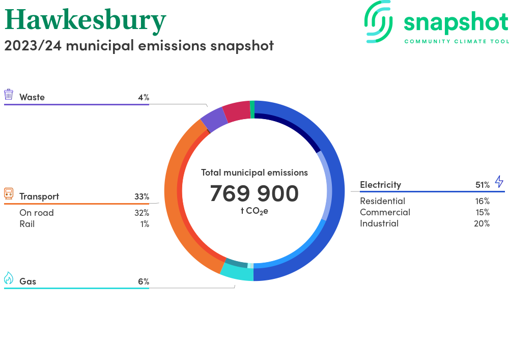Hawkesbury is a city that is moderate in size relative to the state average and has a moderate urban density. Its major emissions source is electricity consumption, due to the community’s scale of population and commercial activity. The second largest source of emissions is on road transportation.