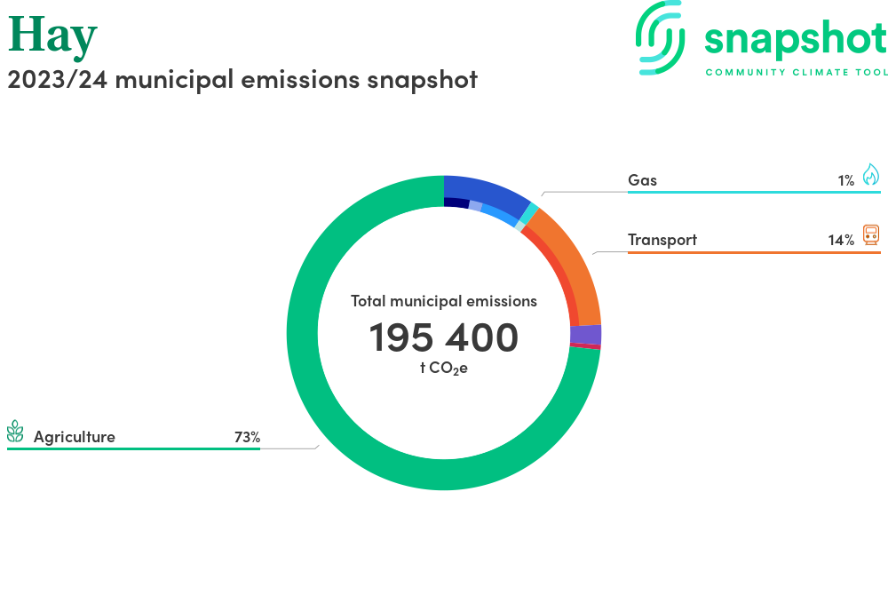 Hay is a regional area that is large in geographical area relative to the state average and has a very low urban density. Its major emissions source is agriculture, due to the community’s relatively large amount of agricultural activity and low population. The second largest source of emissions is on road transportation.
