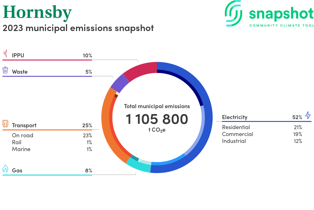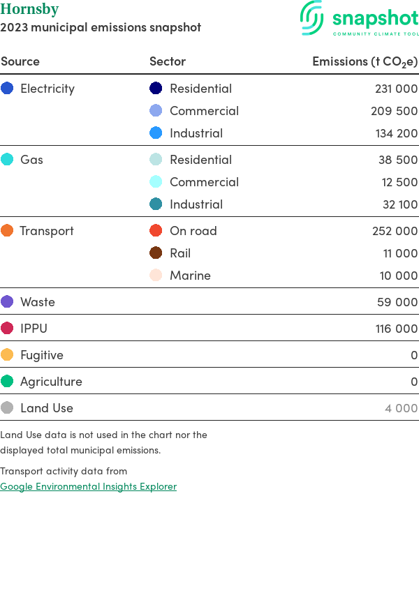 Hornsby is a regional area that is geographically small relative to the state average and has a high urban density. Its major emissions source is electricity consumption with the majority of this coming from residential electricity consumption.