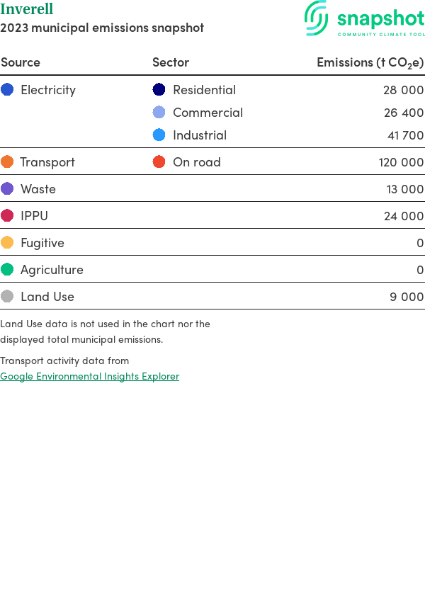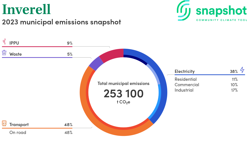 Inverell is a regional area that is large in geographical area relative to the state average and has a low urban density. Its major emissions source is on road transportation, due to the community’s larger commuting and other travel requirements. The second largest source of emissions is electricity consumption.