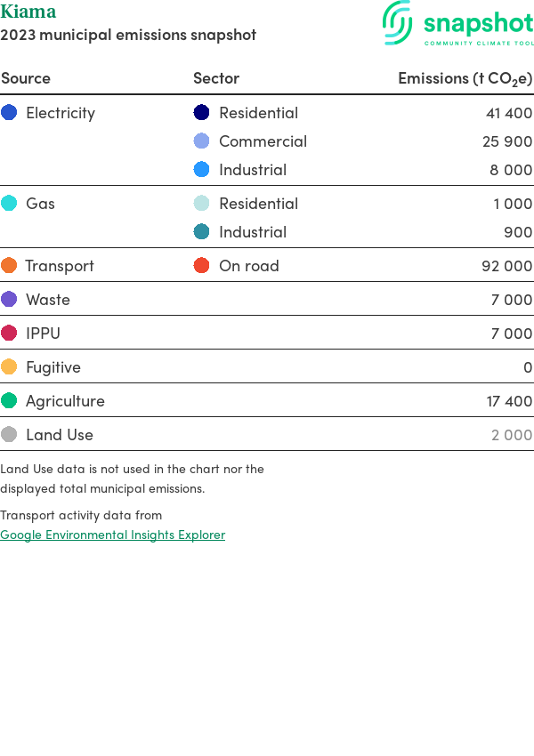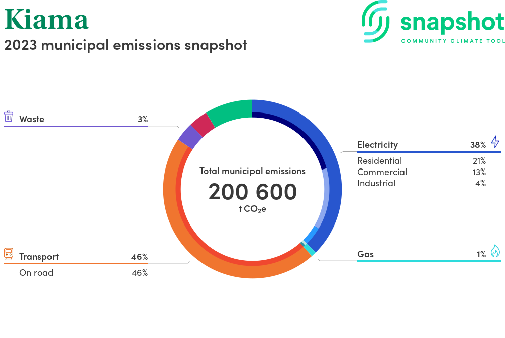 Kiama is a regional area that is geographically small relative to the state average and has a moderate urban density. Its major emissions source is on road transportation, due to the community’s larger commuting and other travel requirements. The second largest source of emissions is electricity consumption.