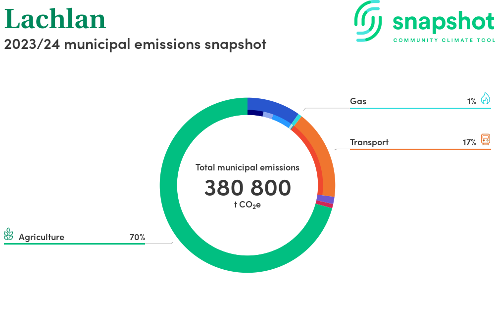 Lachlan is a regional area that is large in geographical area relative to the state average and has a very low urban density. Its major emissions source is agriculture, due to the community’s relatively large amount of agricultural activity and low population. The second largest source of emissions is on road transportation.