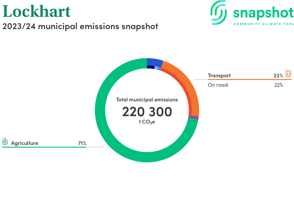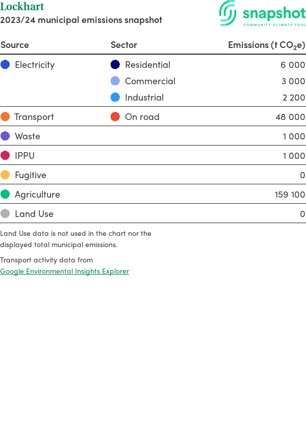 Lockhart is a regional area that is moderate in size relative to the state average and has a low urban density. Its major emissions source is agriculture, due to the community’s relatively large amount of agricultural activity and low population. The second largest source of emissions is on road transportation.