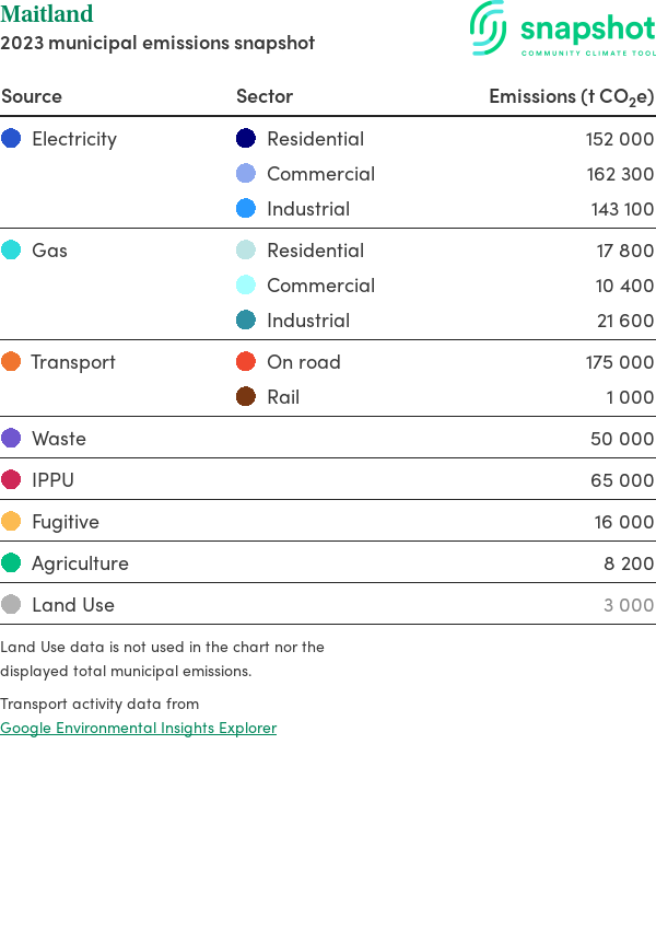 Maitland is a city that is geographically small relative to the state average and has a moderate urban density. Its major emissions source is electricity consumption with the majority of this coming from commercial electricity consumption.