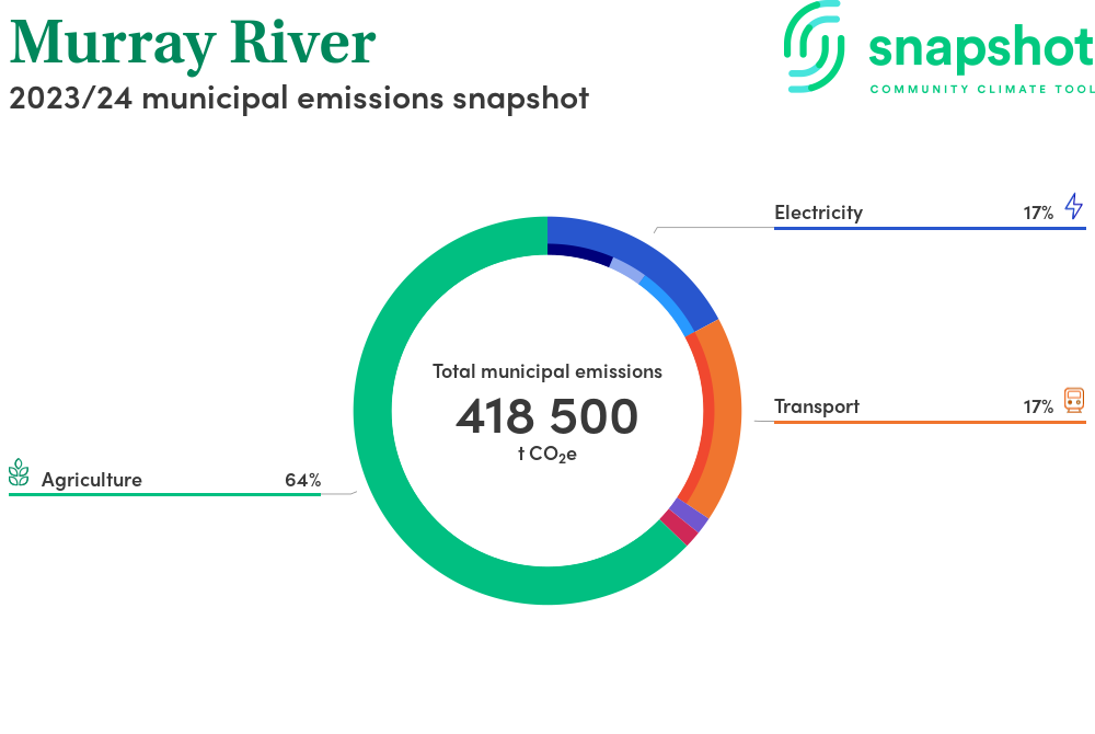 Murray River is a regional area that is large in geographical area relative to the state average and has a low urban density. Its major emissions source is agriculture, due to the community’s relatively large amount of agricultural activity and low population. The second largest source of emissions is electricity consumption.