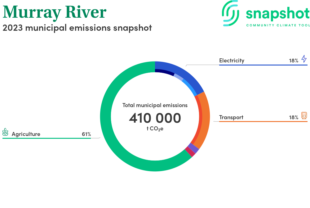 Murray River is a regional area that is large in geographical area relative to the state average and has a low urban density. Its major emissions source is agriculture, due to the community’s relatively large amount of agricultural activity and low population. The second largest source of emissions is electricity consumption.