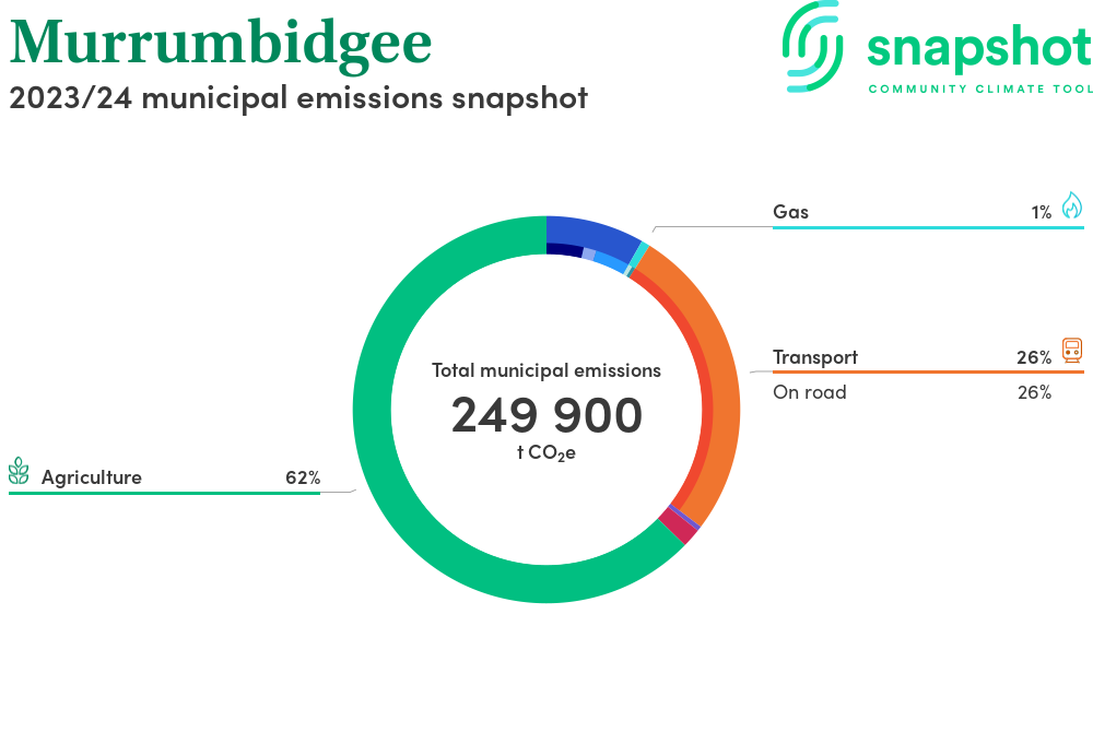 Murrumbidgee is a regional area that is moderate in size relative to the state average and has a very low urban density. Its major emissions source is agriculture, due to the community’s relatively large amount of agricultural activity and low population. The second largest source of emissions is on road transportation.