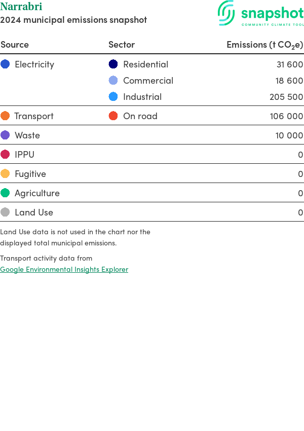 This report outlines the major sources of carbon emissions for the entire region (municipality, electorate, or state). Due to the approximate nature of the profile, the emission values are represented as rounded numbers. This report includes the following sources:
