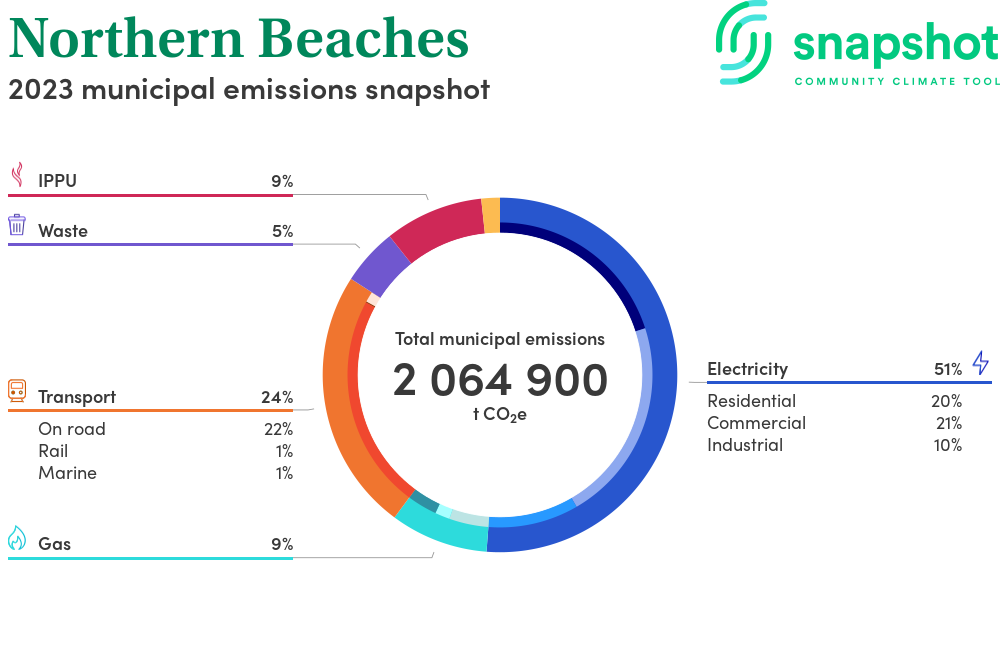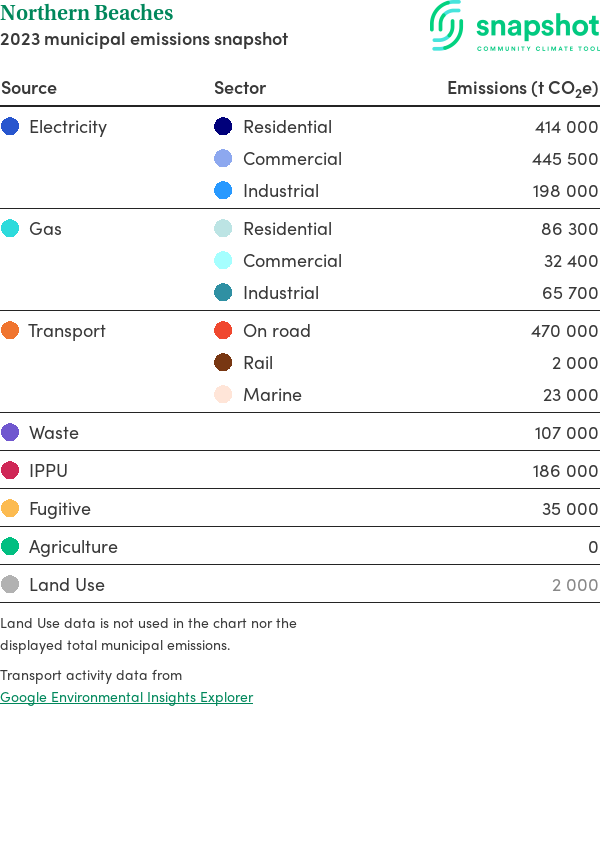 Northern Beaches is a regional area that is geographically small relative to the state average and has a high urban density. Its major emissions source is electricity consumption with the majority of this coming from residential electricity consumption.